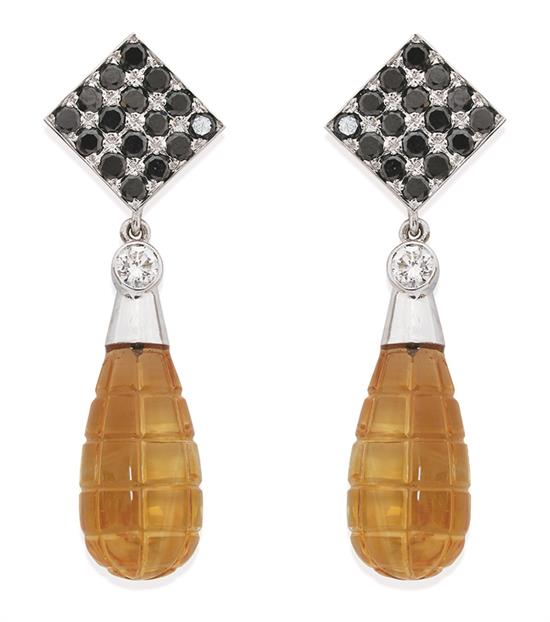 Each earring comprising a carved citrine drop with diamond set cap suspended below a black diamond set cluster stud fitting, in 18ct white gold.