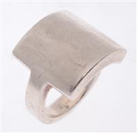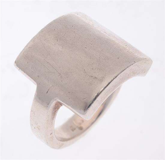 The plaque style ring styled in sterling silver, ring size I-J, boxed.