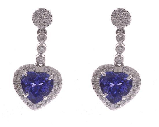 Each earring set with a heart shaped tanzanite weighing 3.0cts, within a border of round brilliant cut diamonds, suspended on a diamond set drop and stud fitting in 18ct white gold, independent valuation available.