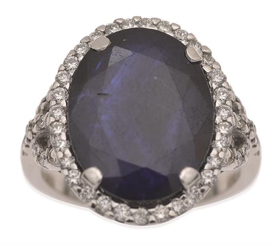 Of cluster design, centrally set with an oval sapphire weighing 11.82cts, within a border of round brilliant cut diamonds and diamond set shoulders, in 18ct white gold, Bauer Gemmological report and independent valuation available, ring size M-N.