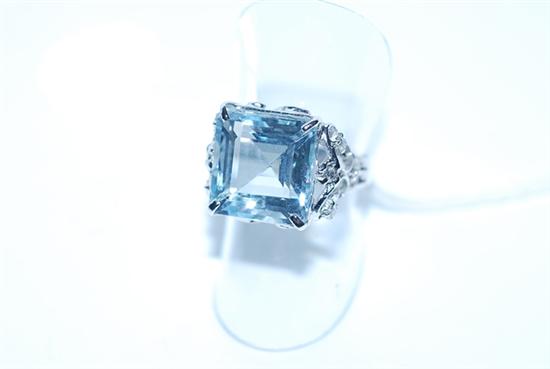 Centrally set with an emerald cut aquamarine weighing 10.6cts within decorative scrolled diamond set shoulders, in 18ct white gold, ring size K-L.