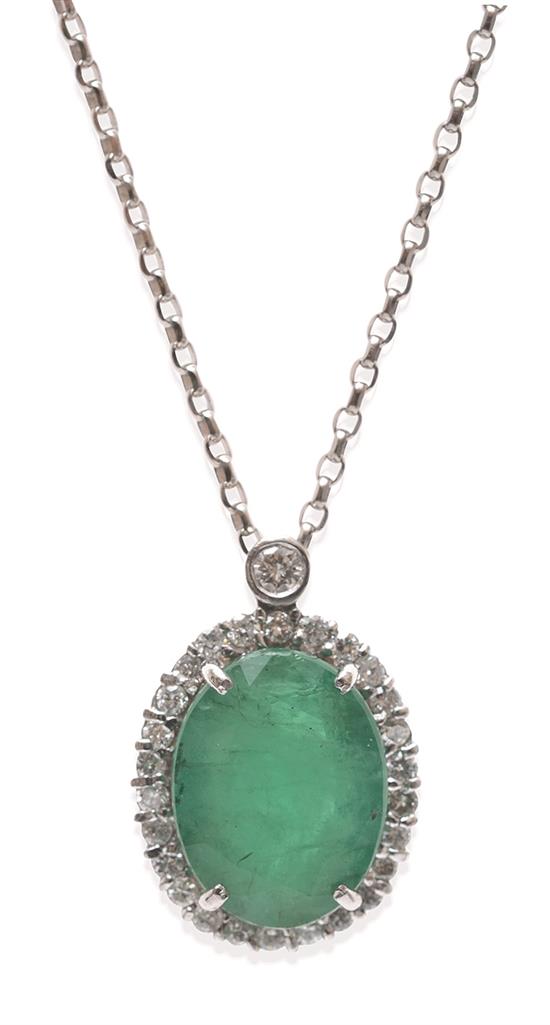 Centrally set with an oval emerald weighing 6.40cts, within a border of round brilliant cut diamonds and a diamond set surmount, on a fine belcher link chain, in 18ct white gold.