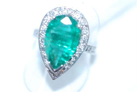Featuring a pear cut emerald weighing 4.20cts, within a border of grain set diamonds totalling 0.75cts, in 18ct white gold, ring size L-M.