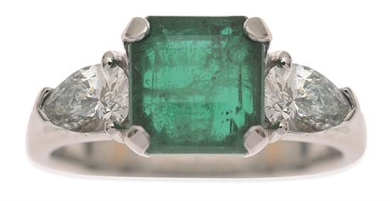 Centrally set with an emerald cut emerald weighing 3.65cts, flanked by a pear cut diamond to either side, together totalling 0.76cts, in 18ct white gold, independent valuation available, ring size L-M.