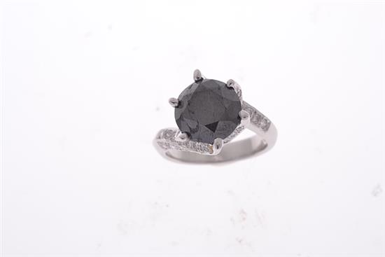 Centrally set with a round brilliant cut black diamond weighing 8.0cts, within curved diamond set claws and shank totalling 1.10cts, in 18ct white gold, ring size M-N.
