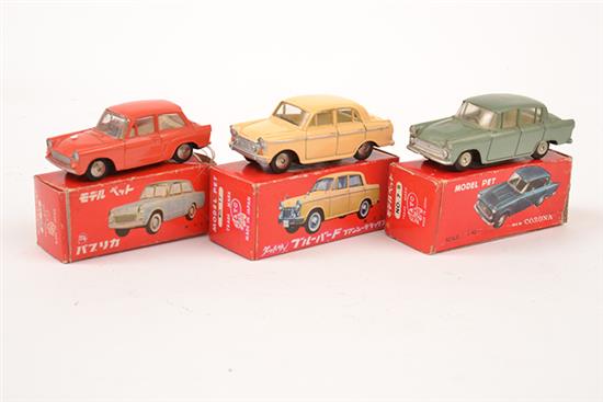 3 MODEL PET MODELS INCLUDING 7S CORONA; 14 TOYOTA PUBLICA; AND 17 DATSUN BLUEBIRD (VG-M BOXES G) (3)