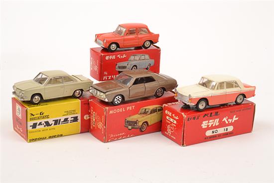 4 MODEL PET MODELS INCLUDING 10S REISSUE NISSAN CEDRIC; 14 TOYOTA PUBLICA; 18 ISUZU BELLEL; AND 29 CONTESSA 1300 COUPE (VG-M BOXES G-VG) (4)