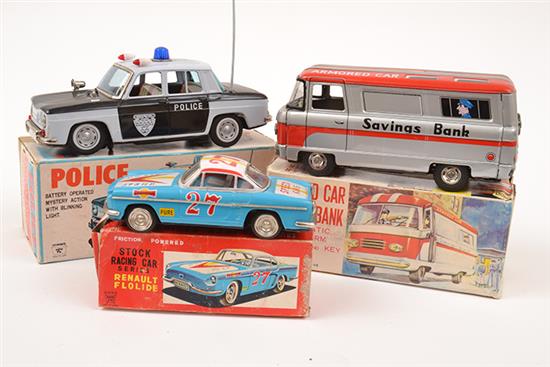 THREE JAPANESE TINPLATE MODELS INCLUDING ICHIKO STOCK RACING CAR; ICHIKO POLICE CAR; AND ARMOURED CAR SAVINGS BANK (G-E BOXES F-G) (3)