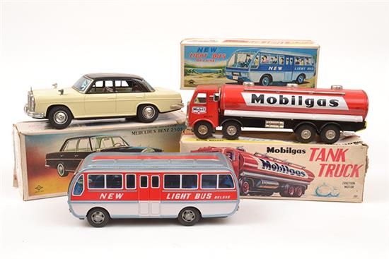 THREE JAPANESE TINPLATE MODELS INCLUDING MOBILGAS TANK TRUCK; NEW LIGHT BUS DELUX; AND FRICTION POWERED MERCEDES BENZ 250S (VG BOXES F-G) (3)