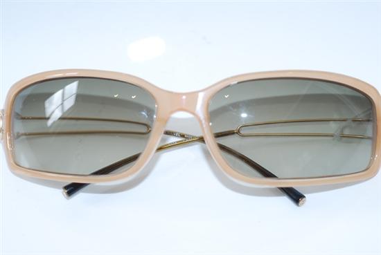 The wrap around glasses styled in fawn composite and gold metal, with case and box.