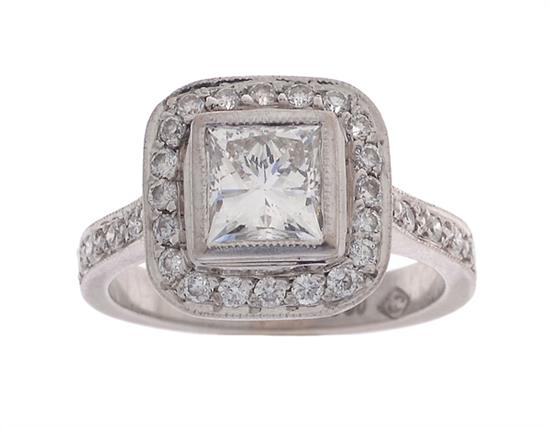 Centrally set with a princess cut diamond weighing 0.96cts, surrounded by sixteen round brilliant cut diamonds and diamond set shoulders, totalling 0.32cts, in 18ct white gold, ring size H-I.