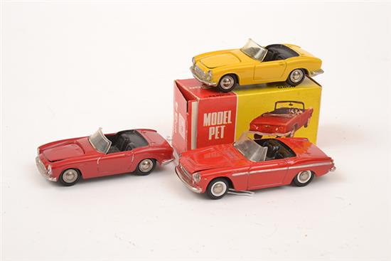 THREE JAPANESE DIECAST MODELS INCLUDING 2 X 34 MODEL PET HONDA S800, ONE YELLOW AND BOXED, THE OTHER RED AND UNBOXED; AND AN UNBOXED DIAPET D-113 DATSUN FAIRLADY (E-M BOX G) (3)