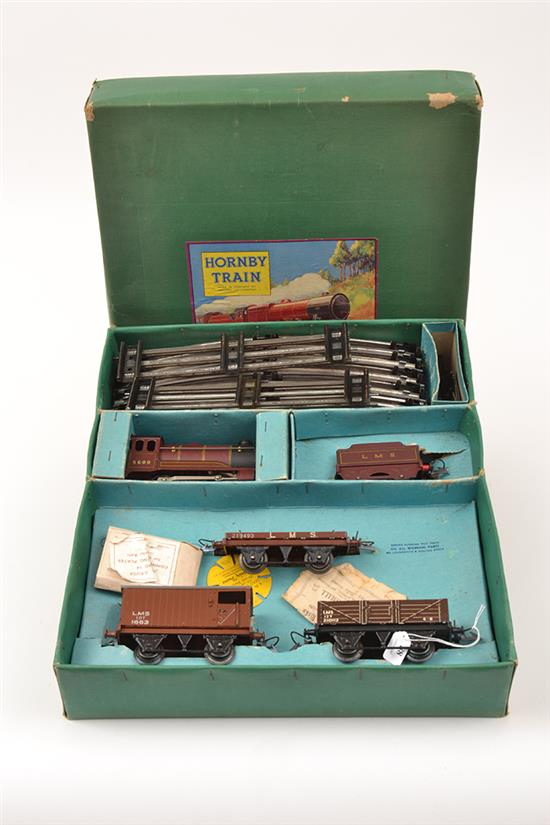 HORNBY TRAINS E 602 GOODS SET, CIRCA 1950S, THE ONLY HORNBY ELECTRIC TRAIN POSTWAR, MAROON LIVERY, TARNISH COMMENSURATE WITH AGE ON TRACKS, WITH INTERNAL PACKAGING (VG-E BOX VG-E)