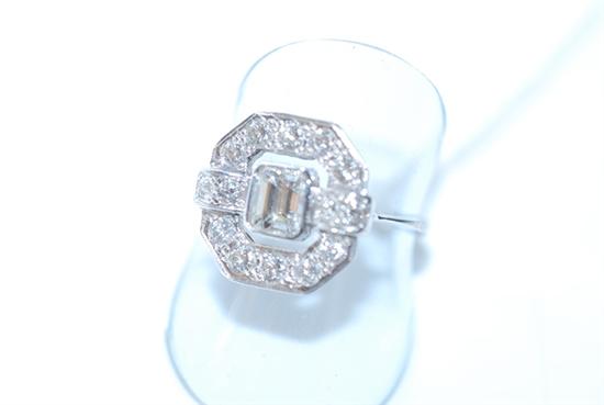 A FANCY YELLOW EMERALD CUT DIAMOND WEIGHING 1.02 CLUSTER RING IN 18CT WHITE GOLD *