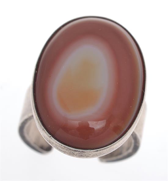 Comprising an oval agate of orange, yellow and white tones bezel set in sterling silver, reference 188B, ring size M-N.