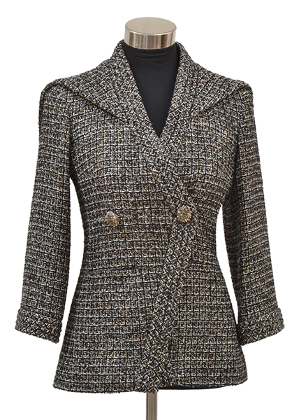 From the 'Crystal grey collection', autumn winter 2012, styled in a black, ecru and gold wool tweed with conforming style metal buttons, P44704V30764 / M8178, labelled size 38.