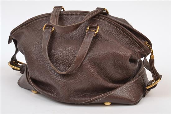 Styled in textured chocolate leather with gold metal hardware, 40 x 36 x 18cm.