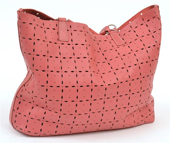 Styled in pierced pink leather with silver metal hardware and inner detachable fabric purse, 44 x 23 x 10cm.