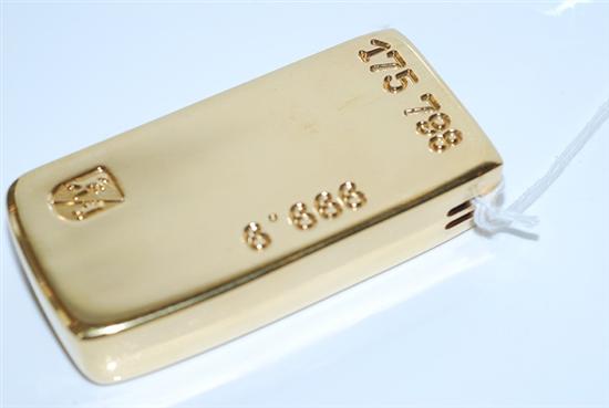 Styled as a bar of gold in gilt metal, 8 x 4cm.