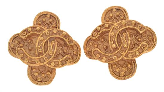 The embossed quatrefoil earrings with monogram detail, in gilt metal to clip fittings, boxed.