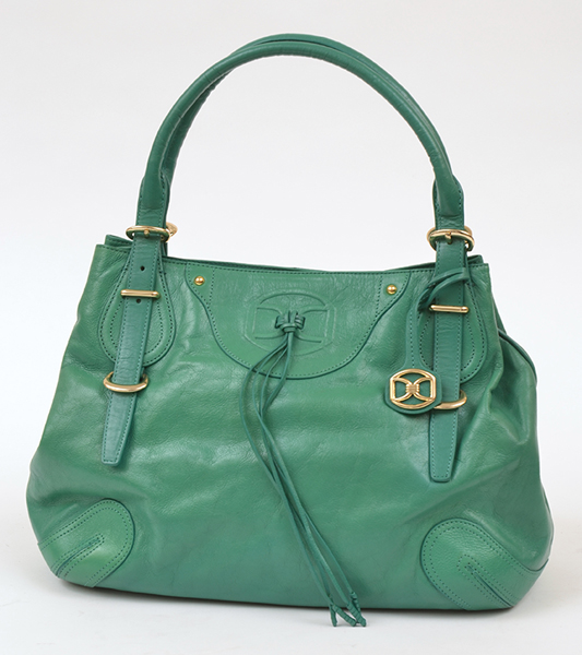 Styled in washed teal green leather trim with gold metal hardware, 24 x 26 x 14cm.