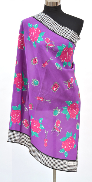 Styled with roses, salon chairs, classical frames and dress mannequins on a purple background with black and white hounds tooth border, 80cm square.