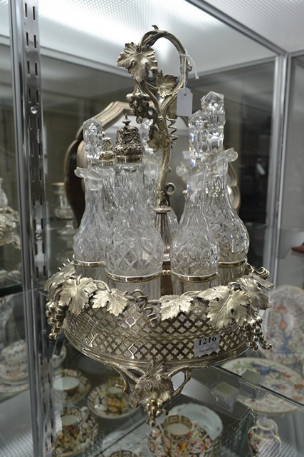 A FINE QUALITY VICTORIAN SILVER PLATE AND CRYSTAL CONDIMENT SET HOUSED ON STAND (COMPLETE)