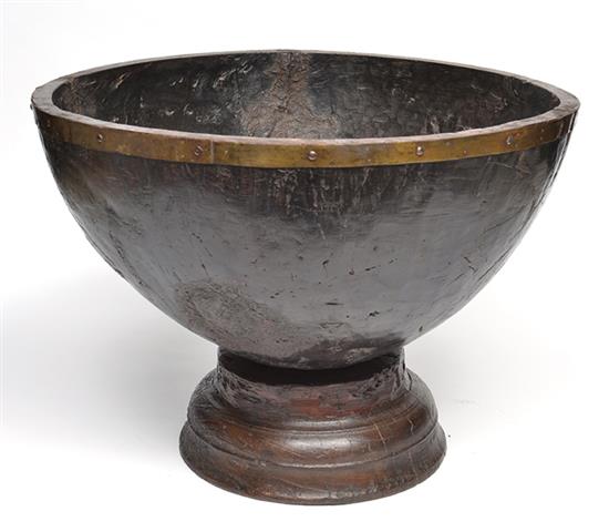 A BRASS MOUNTED WOODEN BOWL 59 X 43 CMS