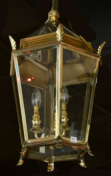 A SIX SIDED GEORGIAN STYLE HANGING LAMP HEIGHT 56 CMS APPROX.