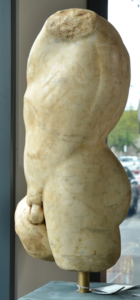 A MARBLE TORSO OF A DANCING SATYR ON METAL PEDASTAL - TORSO-55 CMS AND PEDESTAL - 110 CMS