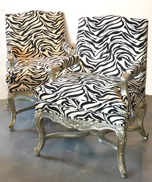 A PAIR OF REPOUSSE SILVER METAL ARMCHAIRS UPHOLSTERED IN BLACK AND WHITE FABRIC 65 X 100 CMS