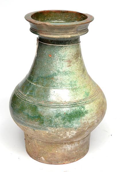 A HAN DYNASTY GLAZED BALUSTER SHAPED VASE 38 CMS HIGH