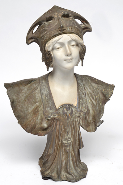 ***WITHDRAWN***AN ART NOUVEAU BRITANNIA METAL AND MARBLE FEMALE BUST 55 CMS