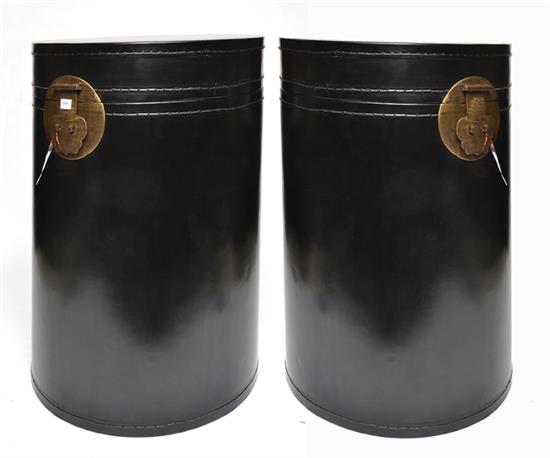 TWO CHINESE BLACK LEATHER CYLINDRICAL STORAGE BINS 48 X 70 CMS