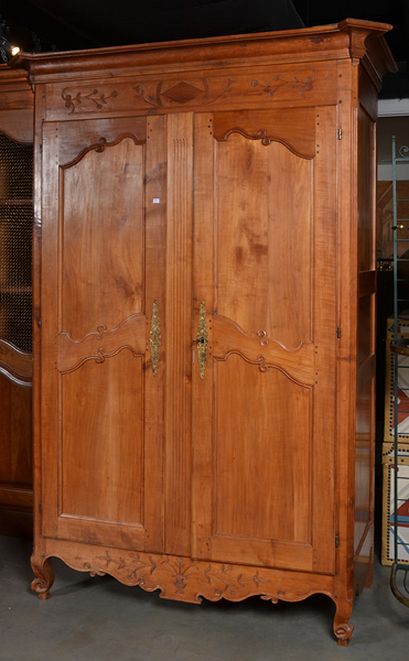 A CHERRY WOOD TWO DOOR ARMOIRE WITH SHAPED PELMET PANELLED DOORS AND REEDED DECORATION 140 X 243 CMS