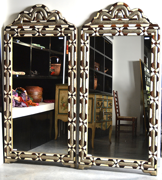 A PAIR OF INDIAN PIER MIRRORS DECORATED WITH REPOUSSE WORK AND HORN INLAY 181 X 85 CMS