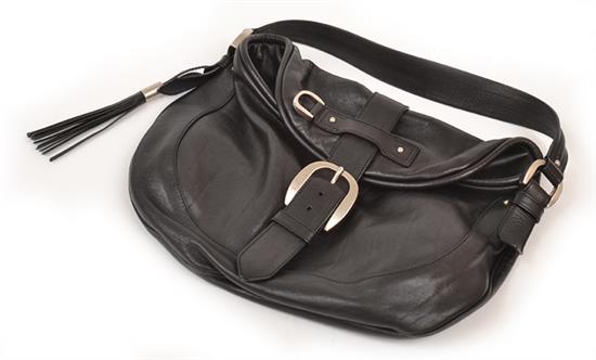 Styled as a saddle bag in black leather with brushed silver metal trim, 40 x 28cm.