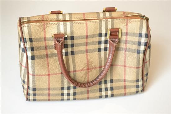 Styled in signature checked canvas with tan leather trim and gold metal hardware, 27 x 20 x 12cm.
