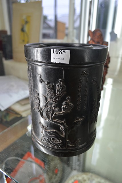 CHINESE CARVED WOOD BRUSH POT WITH FLORAL SCENE