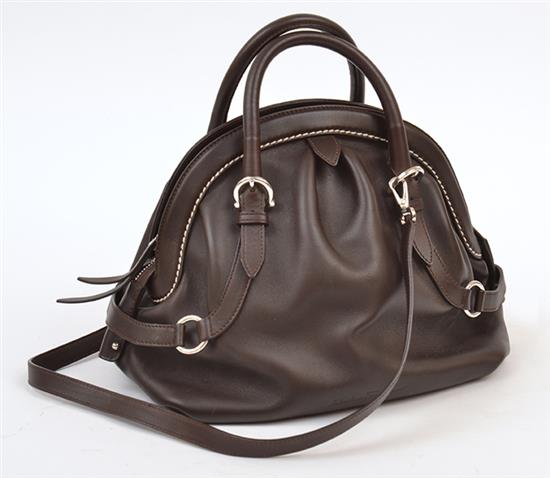 Styled in chocolate brown leather with contrast saddle stitching and silver metal hardware, AQ-21 5837, 30 x 22 x 10cm.