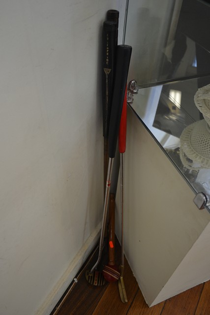 FOUR GOLF PUTTERS AND ONE OTHER STICK