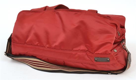 Styled in red parachute fabric with striped detachable shoulder strap and brushed silver metal hardware, 50 x 28 x 16cm.