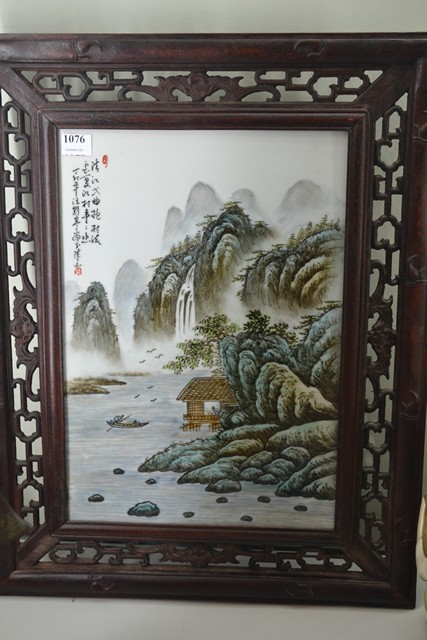 CHINESE ROSEWOOD SCREEN WITH PAINTED TILE INSERT