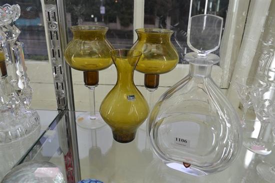 A SMALL GROUP OF SWEDISH GLASS ITEMS INC. ORREFORS DECANTER, YELLOW GLASS CANDLESTICKS