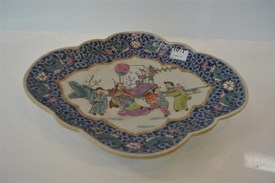 CHINESE SCALLOP EDGED FOOTED DISH WITH SCHOLAR SCENE