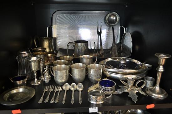 A SHELF OF ASSORTED EP ITEMS INCLUDING CRUETS, KINGS PATTERN FLATWARE, SCHWEPPES, CHRISTENING MUG, TANKARD SET