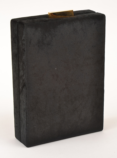 Styled in black velvet with gold metal clasp and conforming detachable shoulder strap, 15 x 20 x 4cm.