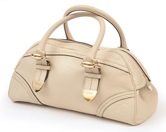 Styled in cream leather with monogram detail, saddle stitching and gold metal hardware, 36 x 18 x 14cm.