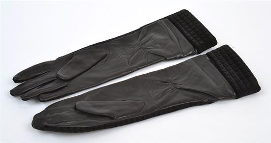 The elbow length gloves styled in black velvet and leather, lablelled size 16.