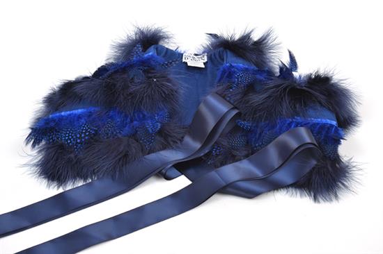 Styled with rows of feathers in various shades of blue, secured with a navy blue satin ribbon